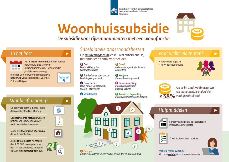 Van 1 maart t/m 30 april kunnen particuliere eigenaren van een woonhuis dat een rijksmonument is subsidie aanvragen voor onderhoud aan het huis dat in het voorafgaande kalenderjaar is uitgevoerd. Niet al het onderhoud is subsidiabel, maar alleen die werkzaamheden die te maken hebben met de instandhouding van het monument.
